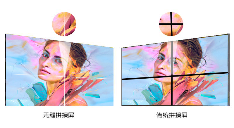 液晶屏正面沒有拼縫,以及沒有黑框線條,兩屏之間共用一整條邊縫補償屏跨接顯示,左邊縫補償屏覆蓋右黑框;上邊縫補償屏覆蓋下黑框。完全覆蓋屏與屏之間的安裝物理間隙;采用小點距邊縫補償顯示技術與液晶顯示單元的完美結合,使畫面整體性近似小間距LED產品,畫質、分辨率、成本、色彩還原、維護等方面大大優于小間距LED產品。